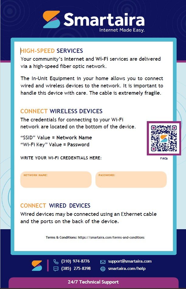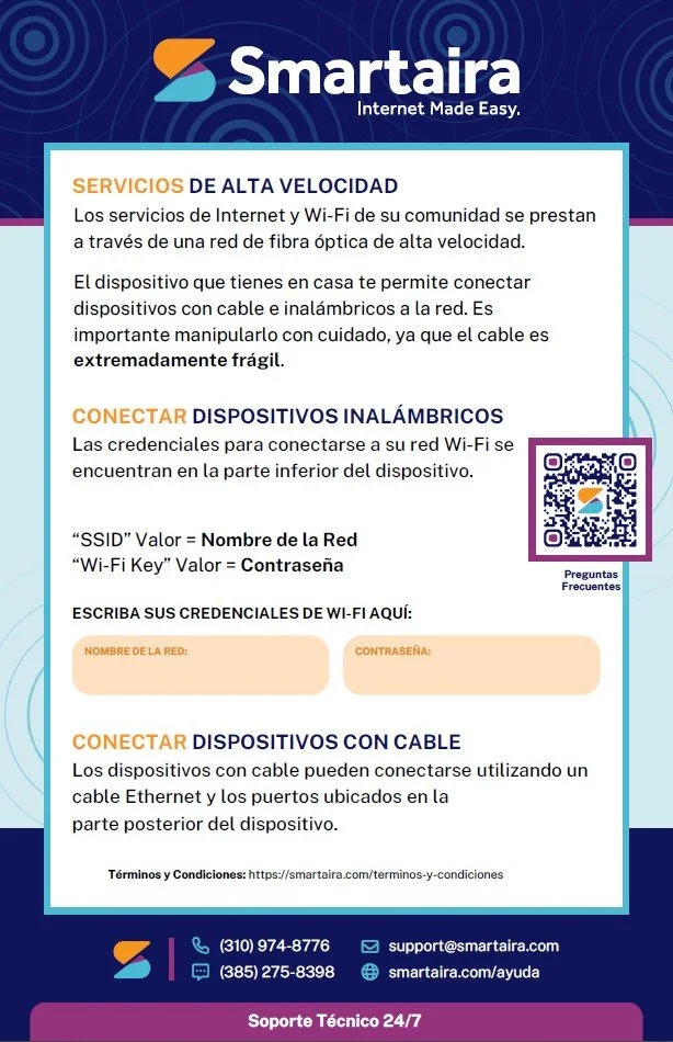 Para obtener asistencia sobre Internet y Wi-Fi, abre un ticket en smartaira.com/ayuda, envíe un correo electrónico a support@smartaira.com, envíe un mensaje de texto al (385) 275-8398 o llame al (310) 974-8776.